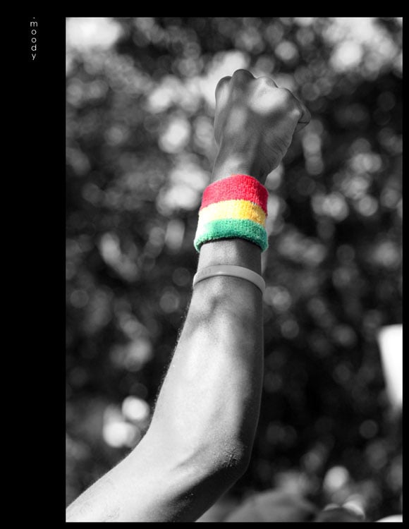 The woman at the center, dressed in black with distinctive silver accents, has her arms outstretched, her body language conveying both exuberance and defiance. Her shirt bears the text "All Black Students?" likely a satirical or provocative challenge to the systemic issues being protested. She is surrounded by a crowd wearing purple shirts, many of which display the letters "AMU" (likely a reference to a university or organization showing solidarity). In the foreground, a protestor with long dreadlocks is positioned with a drum, suggesting that the rhythm and music were central to maintaining the energy, cadence, and morale of the marchers.