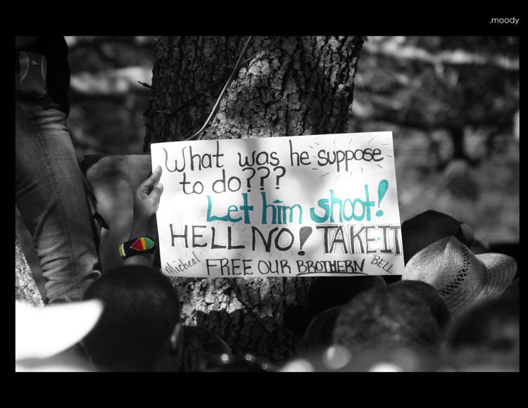 This photograph, taken at the 2007 Jena Six protest, offers a direct defense of one of the accused teenagers, Mychal Bell, transforming the abstract legal argument into a visceral, emotional plea. The sign is handwritten and colored for emphasis, contrasting sharply with the standardized protest literature seen elsewhere.