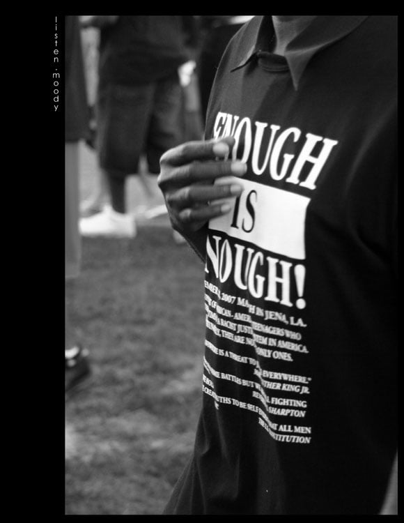 A demonstrator holds a t-shirt bearing the declaration "ENOUGH IS ENOUGH!" during the 2007 Jena Six protest. The garment serves as both a wearable statement and a document of activism, with additional text printed across its surface detailing the case and its significance. This image captures a pivotal moment in American civil rights advocacy, when thousands gathered in Jena, Louisiana to protest the legal proceedings against six African American teenagers accused in a racial confrontation. The photograph documents how protesters transformed personal clothing into tools of public witness and moral declaration. By wearing and displaying these messages, activists communicated their conviction that the injustice exemplified by the Jena Six case represented a broader pattern requiring urgent national attention and action. The black-and-white photography emphasizes the earnestness and gravity of the moment, while the stark visibility of the text underscores how activists used accessible, direct language to mobilize support for racial justice. This demonstration reflected a crucial instance when grassroots organizing brought nationwide focus to questions of racial bias within the American legal system.
