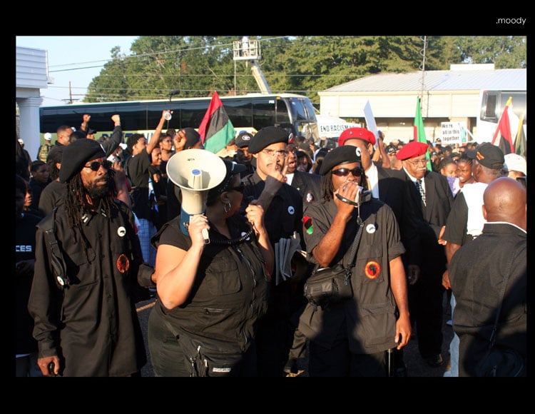 This photograph documents a rallying moment from the Jena Six protest, showing organized activists with megaphones, Pan-African flags, and coordinated positioning. The image captures the movement's infrastructure for mass mobilization and public communication.