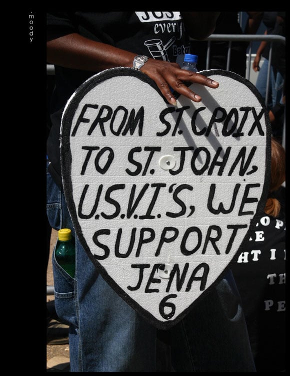 The heart shape frames support as an emotional and moral commitment rather than purely political calculation. The sign's geographic specificity—naming particular islands within the U.S. Virgin Islands—emphasizes that the Jena Six case resonated across distinct communities sharing historical experiences of colonialism, marginalization, and systemic inequality within American structures.
