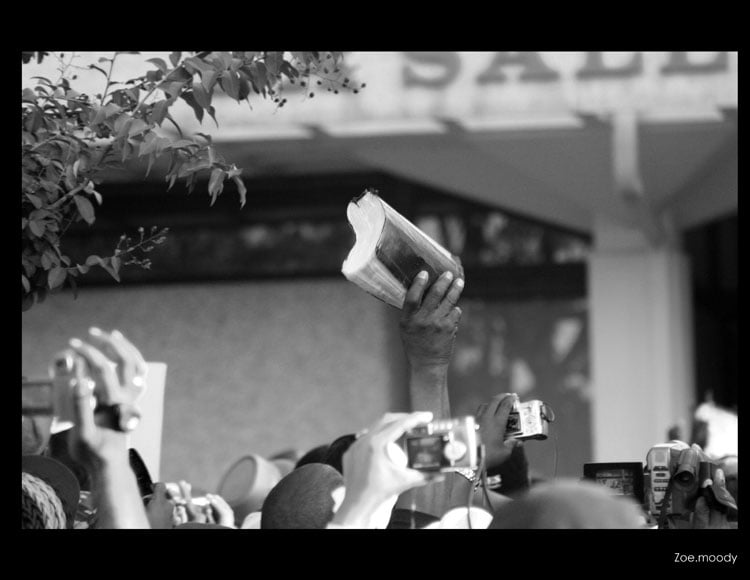 Amid the swell of voices and cameras at the Jena 6 march, a single hand rises above the crowd—gripping a worn Bible, weathered but firm. The image distills a collective moment of faith, resistance, and remembrance. In this gesture, the spiritual and political merge: belief becomes protest, conviction becomes courage.